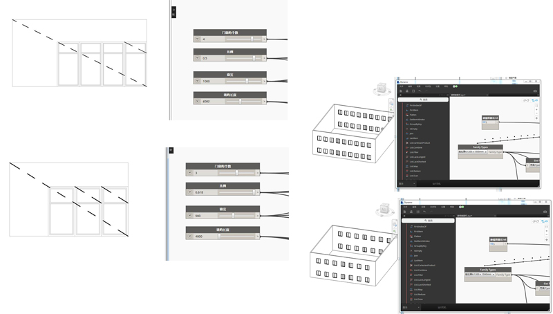 第一个是立面设计,这个不是曲面,只是用同等比例的控制线去推敲进行窗与墙的比例关系,参数化设计从数据生成模型,关键在于控制的变量,这里的变量我给了四个,分别是门窗的个数,比例,门窗的宽度和墙的长度。